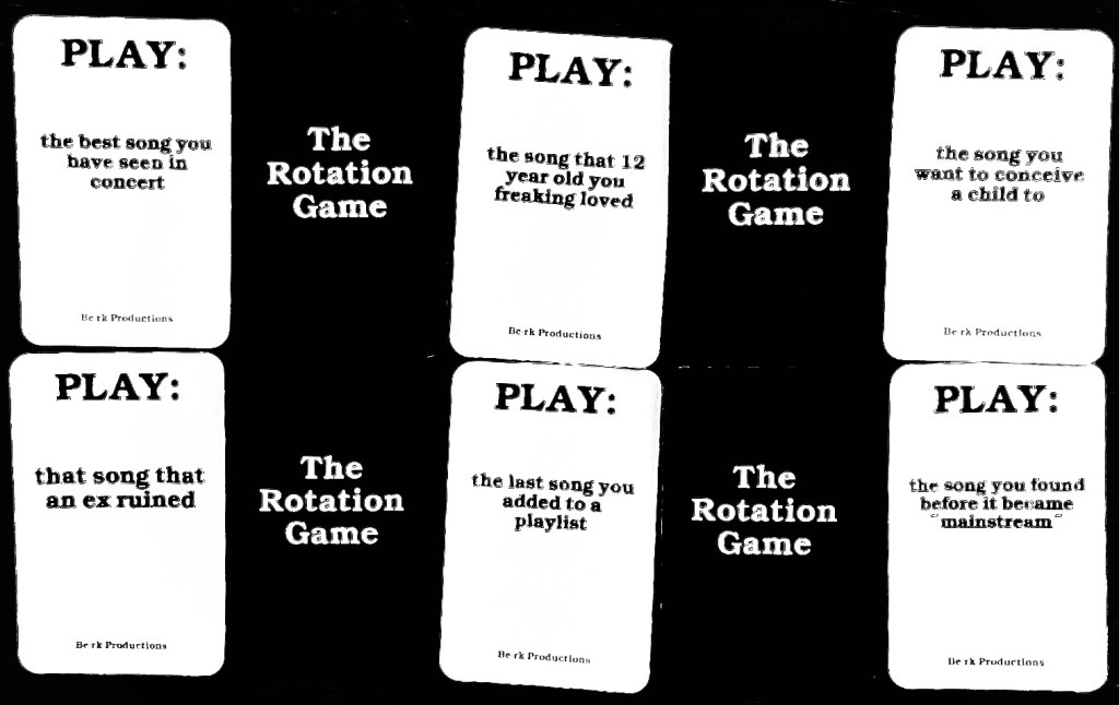 The Rotation Game is a deck of cards with a song prompt written on each one. The Rotation Game doesn’t really have rules.